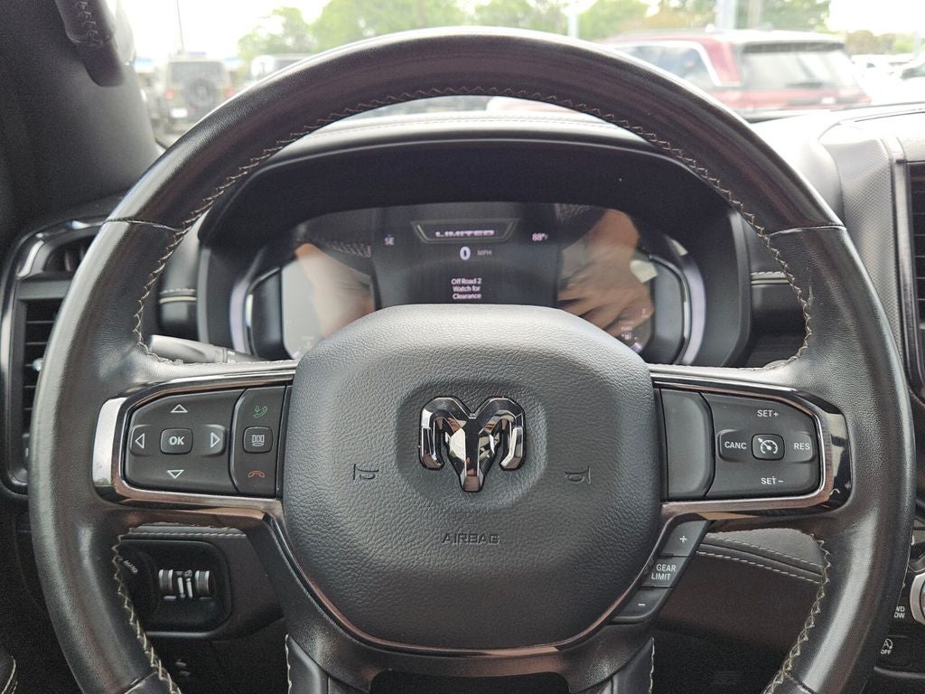 New Price! 10 Speakers, 3.21 Rear Axle Ratio, 33 Gallon Fuel Tank, 4 Way Front Headrests, 4-Wheel Disc Brakes, 48V Belt Starter Generator, ABS brakes, Active Noise Control System, Adjustable pedals, Air Conditioning, Alloy wheels, AM/FM radio: SiriusXM with 360L, Anti-Spin Differential Rear Axle, Apple CarPlay/Android Auto, Audio memory, Auto High-beam Headlights, Auto-dimming door mirrors, Auto-Dimming Exterior Driver Mirror, Auto-dimming Rear-View mirror, Auto-leveling suspension, Automatic temperature control, Bed Utility Group, Bodyside moldings, Brake assist, Bucket Seats, Bumpers: chrome, Chrome Exterior Mirrors, Compass, Convex Wide-Angle Exterior Mirror Insert, Delay-off headlights, Delete Spray In Bedliner, Dome Dual LED Reading Lamp, Driver door bin, Driver Seat Memory, Driver vanity mirror, Dual front impact airbags, Dual front side impact airbags, Dual Rear Exhaust w/Bright Tips, Dual-Pane Panoramic Sunroof, Electronic Stability Control, Exterior Mirrors Courtesy Lamps, Exterior Mirrors w/Heating Element, Exterior Mirrors w/Memory, Exterior Mirrors w/Supplemental Signals, Front anti-roll bar, Front Bucket Seats, Front Center Armrest w/Storage, Front dual zone A/C, Front fog lights, Front License Plate Bracket, Front reading lights, Front Seat Back Map Pockets, Front wheel independent suspension, Full Length Premium Floor Console, Fully automatic headlights, Garage door transmitter, Genuine wood console insert, Genuine wood dashboard insert, Genuine wood door panel insert, Heated door mirrors, Heated Front Seats, Heated front seats, Heated rear seats, Heated Second Row Seats, Heated Steering Wheel, Heated steering wheel, Heavy-Duty Engine Cooling, HEMI Badge, Illuminated entry, Leather steering wheel, LED Dome/Reading Lamp, Low tire pressure warning, Memory seat, MOPAR 4 Adjustable Cargo Tie-Down Hooks, Navigation System, Occupant sensing airbag, Outside temperature display, Overhead airbag, Overhead console, Panic alarm, ParkView Rear Back-Up Camera, Passenger door bin, Passenger vanity mirror, Passive Tuned Mass Damper, Pedal memory, Power 4-Way Driver Lumbar Adjust, Power 4-Way Passenger Lumbar Adjust, Power 8-Way Driver & Passenger Seats, Power door mirrors, Power driver seat, Power passenger seat, Power steering, Power windows, Power-Folding Mirrors, Premium Leather Trimmed Bucket Seats, Quick Order Package 27M Limited, Radio data system, Radio: Uconnect 5 Nav w/12.0 Display, Rain sensing wipers, Rear 60/40 Folding Split Recline Seat, Rear anti-roll bar, Rear seat center armrest, Rear step bumper, Rear window defroster, Remote keyless entry, Security system, Speed control, Split folding rear seat, Steering wheel mounted audio controls, Tachometer, Telescoping steering wheel, Tilt steering wheel, Traction control, Trailer Brake Control, Trailer Light Check, Trailer Reverse Steering Control, Trailer Tire Pressure Monitoring System, Trailer Tow Group, Trip computer, Turn signal indicator mirrors, Variably intermittent wipers, Ventilated Front Seats, Ventilated front seats, Ventilated Rear Seats, Ventilated rear seats, Voltmeter, Wheels: 20 x 9 Aluminum Painted/Polished.